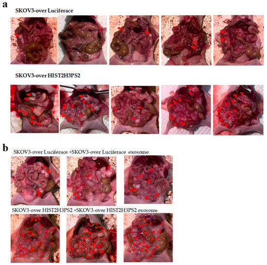 Similarly, mice injected with SKOV3/HIST2H3PS2 cells and their derived EXs showed a significantly higher number of disseminated tumor nodules than those injected with SKOV3/HIST2H3PS2 cells alone (Figure 15a,b and Figure 16b).