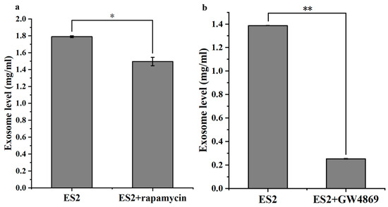 Exosome secretion levels in ES2 cells treated with exosome inhibitors. Exosome concentrations (mg/mL) were measured from the culture supernatants of 1 × 106 ES2 cells treated with (a) 500 nM rapamycin or (b) 10 μM GW4869. Both treatments significantly reduced the level of secreted exosomes compared to untreated controls. * represents p < 0.05; ** represents p < 0.01.