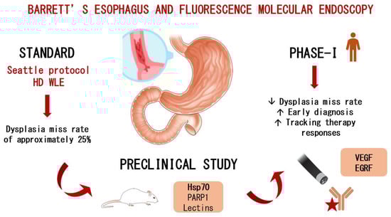 - Fang, H.-Y.; Stangl, S.; Marcazzan, S.; Carvalho, M.J.B.; Baumeister, T.; Anand, A.; Strangmann, J.; Huspenina, J.S.; Wang, T.C.; Schmid, R.M.; et al. Targeted Hsp70 fluorescence molecular endoscopy detects dysplasia in Barrett’s esophagus. Eur. J. Nucl. Med. Mol. Imaging 2022, 49, 2049–2063. [Google Scholar] [CrossRef]