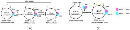 - Zhang, H.W.; Gu, Z.X.; Zeng, Y.; Zhang, Y. Mechanism of heterochromatin remodeling revealed by the DDM1 bound nucleosome structures. Structure 2024, 32, 1222–1230. [Google Scholar] [CrossRef]