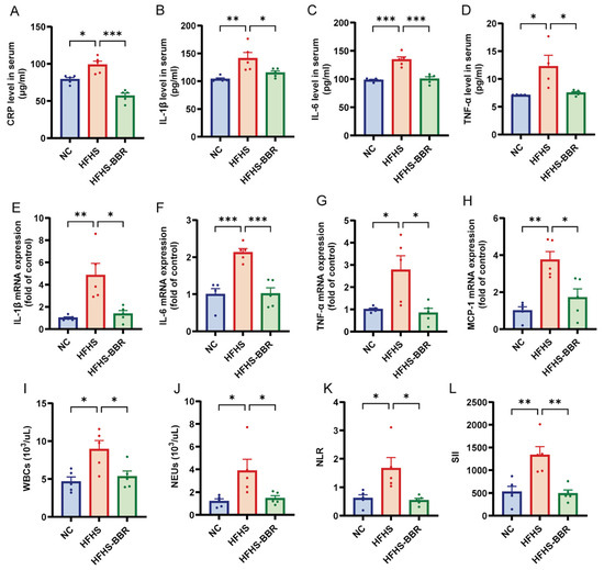 2.7. BBR Mitigates Systemic Inflammation in HFHS Diet-Fed Rats