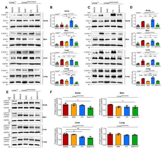 This study showed that in mock-treated LmnaG609G/G609G mice, STAT1 activation was significantly elevated in the skin, liver, and lungs, with a non-significant trend toward increased activation in the aorta, whereas STAT3 activation was elevated in all examined organs (aorta, liver, lungs, and skin). Notably, FTI treatment further exacerbated STAT1 activation in the aorta, skin, and lungs and failed to reduce STAT3 activation but slightly increased it in the aorta, liver, and lungs. In contrast, BAR effectively suppressed FTI-induced STAT1 hyperactivation in all the tested tissues and normalized STAT3 signaling in the aorta, liver, lungs, and skin. These findings establish, for the first time, that beyond the need to mitigate inflammation driven by progerin accumulation in these affected tissues, it is equally essential to prevent FTI-induced STAT1 and STAT3 hyperactivation. Given that FTI is currently prescribed for HGPS, determining whether baricitinib should be co-administered is a critical clinical question.