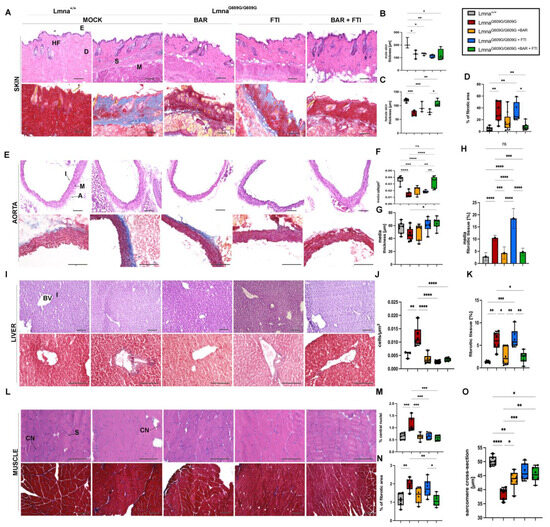 A histological examination of the skin, aorta, liver and muscle tissues revealed extensive tissue degeneration and fibrosis in MOCK LmnaG609G/G609G mice at 90 days of age (Figure 3). These phenotypic changes were mitigated to a certain degree by BAR, FTI, and their combination. MOCK HOM mice exhibited reduced skin thickness compared with control WT-type mice (Figure 3B,C). This deficit was partially restored in the BAR + FTI cohort, underscoring the enhanced efficacy of the combination treatment for skin tissue repair (Figure 3B,C). Elevated dermal fibrosis detected in the MOCK HOM group was significantly reduced by BAR treatment and was nearly completely reversed by BAR + FTI treatment (Figure 3D). In contrast, FTI monotherapy failed to improve dermal fibrosis, indicating its limited efficacy in restoring this parameter (Figure 3D).