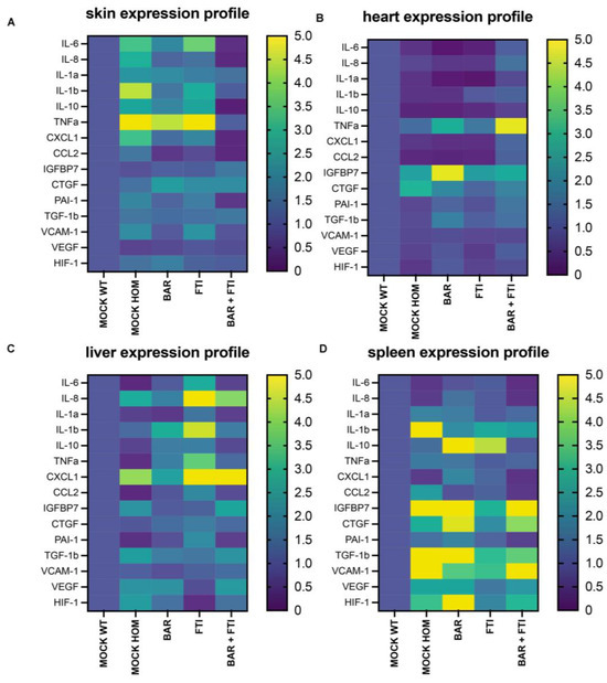 Heatmaps displaying differential mRNA expression across five treatment groups. Each profile represents the relative expression levels of the individual mRNA. Data are presented on a color scale ranging from 0 (dark purple = low expression) to 5 (yellow = high expression). The key markers analyzed include senescence-associated secretory phenotype (SASP), cytokines, and angiogenic and extracellular matrix (ECM)-related markers. The four organs examined are the (A) skin, (B) heart, (C) liver, and (D) spleen. The mRNA levels analyzed include IL-6, IL-8, IL-1a, IL-1b, IL-10, TNFα, PAI-1, TGF-1b, CXCL1, CCL2, IGFBP7, VCAM-1, CTGF, VEGF, and HIF-1. Fold changes are shown relative to the MOCK WT cohort. Data represent a minimum of n = 3 biological replicates per organ and treatment group.