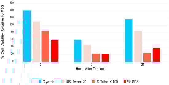 Human skin cell viability of carrier (glycerin) and positive controls. Skin explants were maintained in tissue culture and 3-[4,5-dimethylthiazol-2yl]-2,5-diphenyl-tetrazolium bromide (MTT) reagent was used to evaluate mitochondrial activity. The reported value is the average (n = 3) cell viability normalized to a phosphate buffer (PBS) at each time point. Test agents included the following established human skin irritants (10% Tween 20, 1% Triton X-100, and 5% sodium dodecyl sulfate).