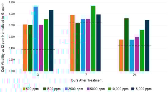 Human skin cell viability versus I2 concentration. I2 (500 to 15,000 ppm) in glycerin. Skin explants were maintained in tissue culture and 3-[4,5-dimethylthiazol-2yl]-2,5-diphenyl-tetrazolium bromide (MTT) reagent was used to evaluate mitochondrial activity. The reported value is the average (n = 3) cell viability normalized to a phosphate buffer (PBS) at each time point. The dashed line (---) at each timepoint displays the normalized cell viability value that corresponds to 50% of the PBS control.