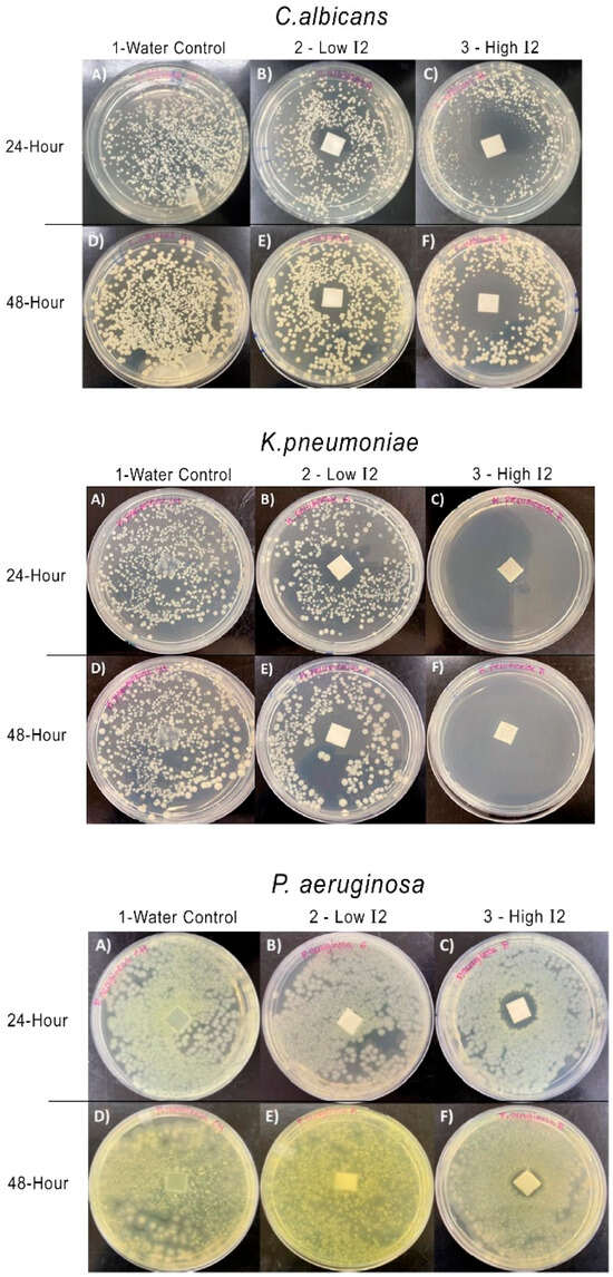 Growth of C. albicans, K. pneumoniae, and P. aeruginosa with and without the presence of I2 gas. Plate images shown at 24 and 48 h in the absence (A,D) or presence (B,C,E,F) of I2 gas at low (B,E) or high (C,F) I2 concentrations. Silicone coupons were treated with 300 ppm aqueous I2 ((B,E) low I2) or 15,000 ppm I2 in glycerin ((C,F) high I2).