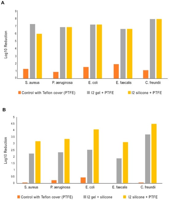 3.2. I2 Vapor Phase Antimicrobial Activity with Silicone Coupons
