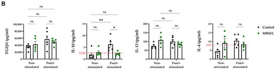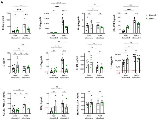 The effect of saponified BSFL oil (MBSFL) on the pro- and anti-inflammatory cytokine characteristics of macrophage polarization. Human primary peripheral blood mononuclear cells (PBMCs) differentiated with 50 ng/mL macrophage colony-stimulating factor (M-CSF) were stimulated with 250 ng/mL Pam3CSK4 (Pam3) for 20 h, in the presence or absence of 600 µM MBSFL. (A) Pro-inflammatory and (B) anti-inflammatory cytokine secretion levels. Cytokine levels in the supernatants were quantified using a multiplexed sandwich enzyme-linked immunosorbent assay (ELISA)-based quantitative array (n = 5–6 ± SEM). Statistical significance: ns = not significant, * p < 0.05, ** p < 0.01, *** p < 0.001, and **** p < 0.0001. Results exceeding the detection range are reported relative to the lower limit of detection (LLD) or upper limit of detection (ULD).
