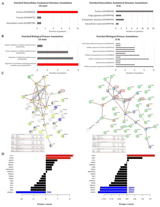 MBSFL supplementation drives dynamic changes in the phosphoproteome of toll-like receptor (TLR)-2-activated macrophages. Differential effects of MBSFL on phosphorylation, 15 min and 3 h following Pam3-stimulation (50 ng/mL) of phorbol 12-myristate-13-acetate (PMA)-primed THP-1 macrophages. (A) Enriched intracellular anatomical structure annotations showing differential ratios from cellular components and (B) enriched biological process annotations, derived from the Protein ANalysis THrough Evolutionary Relationships (PANTHER) classification system for phospho-proteins identified as differentially expressed by MBSFL supplementation. (C) Protein–protein interaction network of differentially phosphorylated proteins. The network was generated using the STRING database. Red circles highlight proteins referenced in the Results. (D) Kinase-Substrate Enrichment Analysis (KSEA). The top kinases are depicted using a p-value threshold of 0.05, downregulated kinases shown in blue and upregulated kinases shown in red.
