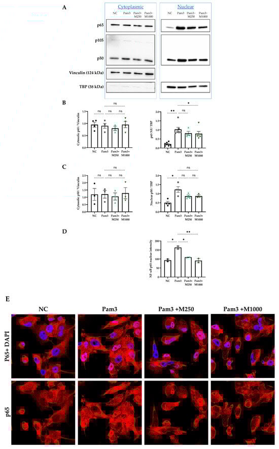Regulation of nuclear factor kappa B (NF-κB) nuclear translocation by MBSFL in TLR2-activated macrophages. PMA-primed THP-1 macrophages were stimulated with 50 ng/mL Pam3 in the presence or absence of MBSFL at the indicated concentrations for 12 h. Unstimulated cells served as the negative control (NC). (A) Subcellular NF-κB p65 and p50 protein levels, detected by western blotting and (B,C) quantified by densitometry. Vinculin and TBP were used as loading controls for cytoplasmic and nuclear protein fractions, respectively, to ensure equal protein loading and fraction purity (n = 3–6 ± SEM). (D) Quantification and (E) representative confocal images of p65 nuclear immunofluorescence intensity (red), with nuclei counterstained with DAPI (blue). Magnification ×100. Data represent the mean ± SEM from 2 biological repeats, each with 3 technical repeats. Statistical significance: ns = not significant, * p < 0.05 and ** p < 0.01.