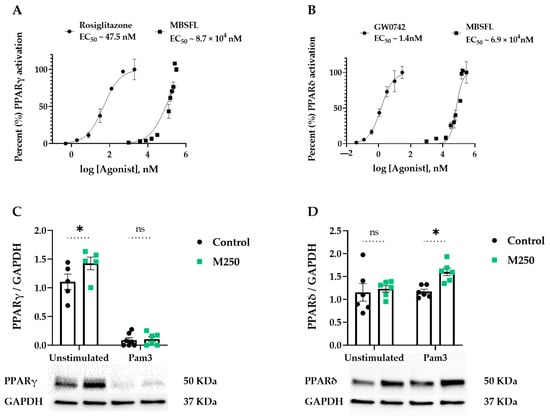 We next attempted to identify the interplay between inflammation and metabolism by evaluating the effect of MBSFL on key metabolic factors involved in M1 attenuation: PPARs and AMPK. PPAR activation was measured by a luciferase reporter gene assay and protein expression was measured by western blotting. As depicted in Figure 4A,B, MBSFL oil enhanced both PPARγ and PPARδ activation, albeit demonstrating relatively weak agonistic activity, with a half maximal effective concentration (EC50) approximately 103–104 times higher relative to the reference agonists. The western blot analysis revealed that MBSFL significantly increased PPARγ protein levels in PMA-primed quiescent THP-1 cells. However, upon Pam3 stimulation for 24 h, PPARγ abundance was nearly abolished, and MBSFL failed to antagonize this effect (Figure 4C). Conversely, MBSFL increased PPARδ abundance upon Pam3 stimulation (Figure 4D). AMPK activity, as was evaluated by its relative phosphorylation levels on Thr172, and the phosphorylation levels of its downstream target, acetyl CoA carboxylase (ACC), was relatively low in all treatment groups, in marked contrast to their increase by AICAR, an AMPK activator reference (Figure 4E,F). These findings suggest that the anti-inflammatory effects of MBSFL are mediated through PPARδ activation.