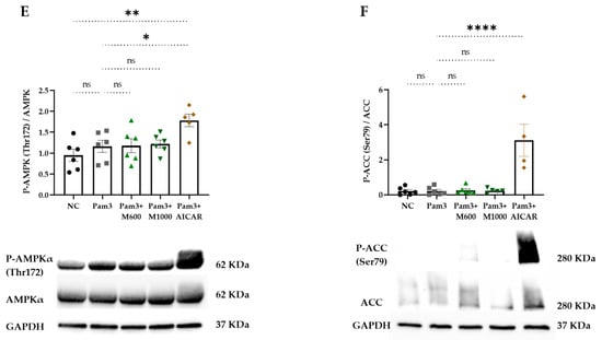 Cells were treated with MBSFL at concentrations ranging from 250 to 1000 µM, with vehicle controls receiving BSA alone. Vehicle-treated controls were included and analyzed in all downstream assays alongside treatment groups. 5-aminoimidazole-4-carboxamide ribonucleotide (AICAR; Sigma-Aldrich Chemical Co., Burlington, MA, USA, catalog no. A9978) was treated at 0.5 mM in positive control samples for P-AMPK and P-ACC activation. One hour after treatment, cells were stimulated with the synthetic triacylated lipopeptide Pam3CSK4 (Pam3; InvivoGen, San Diego, CA, USA, catalog code: tlrl-pms) at 250 ng/mL for PBMC cultures or 50 ng/mL for THP-1 cells. Following the stimulation period, supernatants and cells were harvested for subsequent analysis.
