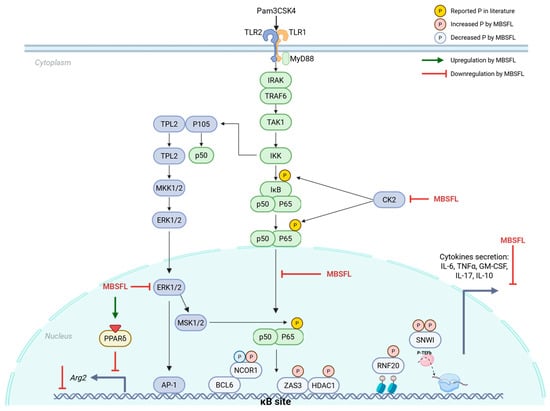 Illustration depicting the potential immunometabolic regulation of MBSFL on pro-inflammatory responses in M1 macrophages. The diagram highlights the modulation of key signaling factors by MBSFL, indicated by red or green arrows. TLR2 signaling in macrophages activates the NF-κB pathway through the degradation of inhibitor κB (IκB), which releases p50/p65 dimers to translocate to the nucleus and activate the transcription of pro-inflammatory genes. MBSFL inhibits NF-κB p65 nuclear translocation. Furthermore, MBSFL reduces the activity of casein kinase II (CK2), a kinase that facilitates p50/p65 activation via the atypical pathway, by phosphorylating IκB at Ser293 and p65 at Ser529. MBSFL also diminishes extracellular signal-regulated kinases (ERK) activity, which mediates p65 phosphorylation and activation at Ser276 within the nucleus. Additionally, MBSFL acts as an activator of PPARδ, which reportedly antagonize both ERK activation and p50/p65 nuclear translocation. This cascade of effects ultimately leads to the attenuation of M1 macrophage pro-inflammatory responses, as evidenced by a reduction in the secretion of pro-inflammatory cytokines. Additional signaling molecules depicted include: myeloid differentiation primary response 88 (MyD88), interleukin-1 receptor-associated kinase (IRAK), TNF receptor-associated factor 6 (TRAF6), transforming growth factor beta-activated kinase 1 (TAK1), IκB kinase (IKK), B-cell lymphoma 6 (BCL6), nuclear receptor corepressor 1 (NCOR1), histone deacetylase 1 (HDAC1), zinc finger and SCAN domain-containing protein 3 (ZAS3), SNW domain-containing protein 1 (SNWI), ring finger protein 20 (RNF20), tumor progression locus 2 (TPL2), mitogen-activated protein kinase kinase 1/2 (MKK1/2), mitogen- and stress-activated protein kinase 1/2 (MSK1/2) and activator protein 1 (AP-1). Created with BioRender.com.
