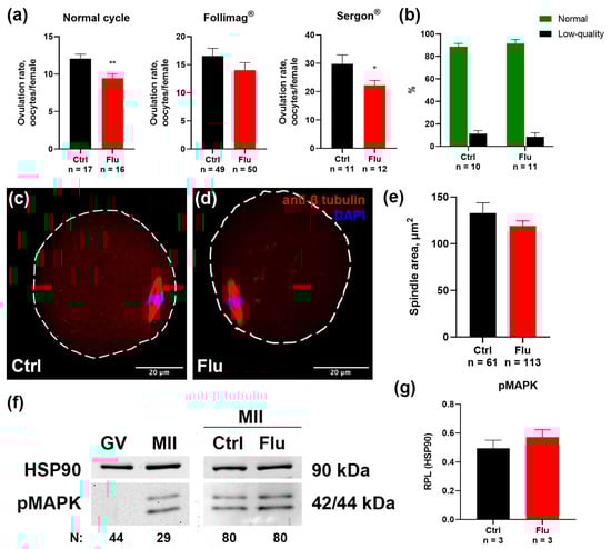 Effects of fluoxetine (Flu) on the quantity and quality of ovulated MII oocytes. (a) Number of ovulated MII oocytes obtained from the oviducts of females in a normal cycle and induced by PMSG preparations Follimag® and Sergon®. M ± SEM, *—p < 0.05, and **—p < 0.01, according to the Mann–Whitney U test. (b) The ratio of morphologically normal MII oocytes to abnormal low-quality oocytes. (c,d) MII oocytes from control (c) and fluoxetine-treated (d) females immunostained with antibodies against β-tubulin to reveal meiotic spindle for morphologic evaluation. (e) Values of the lateral projection area of the meiotic spindle of MII oocytes, M ± SEM. (f) Western blot analysis of pMAPK protein expression in control GV and MII oocytes, and in MII oocytes from control (Ctrl) and fluoxetine-treated (Flu) females. HSP90 used as internal loading control. (g) Quantification of pMAPK relative protein expression level (RPL) calculated in relation to HSP90, M ± SEM.