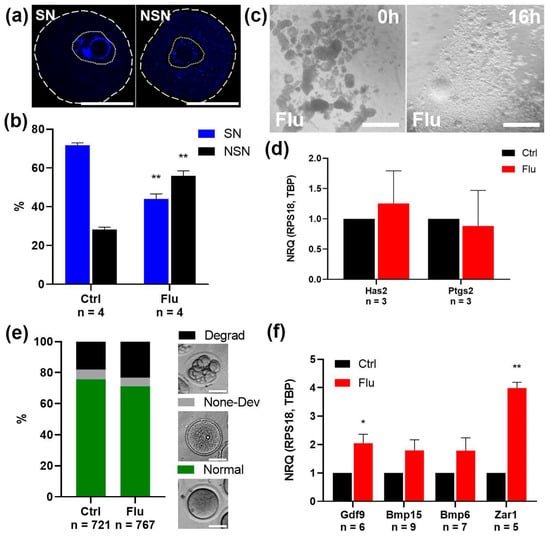 To assess the potential effects of fluoxetine on earlier stages of oogenesis, we analyzed the maturation of GV-stage oocytes obtained 36 h after superovulation induction. Morphological analysis of chromatin structure revealed a significant reduction in the proportion of fully mature SN (surrounded nucleolus) oocytes in the fluoxetine-treated group (42%) compared to the control group (72%) (Figure 2a,b). This result suggests a delay in the cytoplasmic maturation of GV oocytes, which may underlie the observed decrease in ovulated oocyte numbers in fluoxetine-treated females.