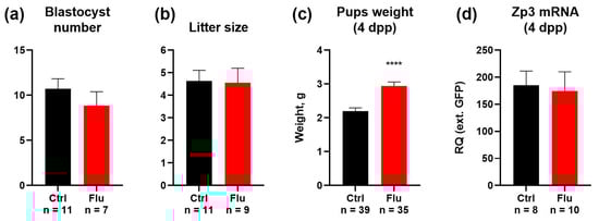 Effects of fluoxetine on reproduction and developmental potential, M ± SEM. (a) Number of blastocysts contained in the uterine horns on day 3.5 of development, M ± SEM. (b) Litter size of control females and females taking fluoxetine during pregnancy, M ± SEM. (c) Weight of mouse pups on the 4th day of life (4 dpp). M ± SEM, ****—p < 0.0001, according to the Mann–Whitney U test. (d) qPCR analysis of 4 dpp females’ ovarian reserve by expression of the marker Zp3 normalized to an external RNA standard (GFP), M ± SEM.