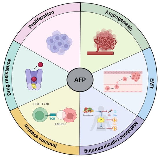 Cancer therapy resistance occurs when cancer cells become resistant to treatment. This is a significant cause of treatment failure and cancer recurrence [,,]. AFP contributes to the development of resistance to anticancer therapies through various mechanisms. It can influence the expression and activity of drug transporters on the cell membrane, such as P-glycoprotein. Increased expression of these transporters leads to an enhanced efflux of chemotherapeutic agents from cells, thereby reducing their intracellular concentrations and efficacy []. Moreover, AFP promotes cell survival pathways and inhibits programmed cell death by regulating the levels of intrinsic apoptosis markers, such as Bax and Bcl2 []. This helps cancer cells resist the cytotoxic effects of chemotherapy. Additionally, AFP may alter the tumor microenvironment by promoting chronic inflammation and recruitment of immunosuppressive cells, creating a more favorable environment for tumor cells to evade the effects of therapies []. Furthermore, it can induce metabolic adaptations, such as enhanced glycolysis and altered energy metabolism, in cancer cells. These changes provide energy and intermediates necessary for survival during treatment []. Finally, AFP promotes EMT, a process that increases the invasive and migratory potential of cancer cells. EMT is associated with the acquisition of stem cell-like properties that can further enhance resistance to chemotherapy and lead to tumor recurrence. Therefore, through these diverse mechanisms, AFP plays a significant role in promoting resistance to anticancer therapies, complicating treatment strategies, and potentially leading to poor clinical outcomes. Figure 2 summarizes the functions of AFP in relation to HCC progression.