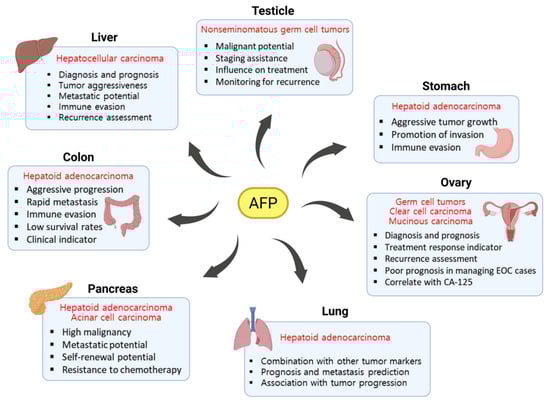 Overexpression of AFP has been identified in certain rare subtypes of lung cancer, suggesting its potential utility in both diagnosis and prognosis. Hepatoid adenocarcinoma of the lung (HAL) is an extremely rare subtype of lung cancer that originates in the lung but exhibits histological and molecular characteristics similar to HCC. In a reported case, the patient’s serum AFP level was extremely elevated, reaching several thousand ng/mL. Histologically, the tumor showed hepatoid differentiation with positive immunohistochemical staining for AFP, HepPar-1, and GPC3, indicating a tumor profile highly reminiscent of liver cancer. Thus, AFP may serve as a useful diagnostic biomarker for HAL, which is typically associated with a poor prognosis []. Another study demonstrated the predictive value of AFP in assessing ocular metastasis in lung cancer. The results showed that patients with serum AFP levels above 0.54 ng/mL had a significantly increased risk of ocular metastasis, and AFP exhibited high sensitivity (98.3%), suggesting excellent detection capability []. In addition, a study involving non-small cell lung cancer patients showed that decreased expression of miR-668-3p was associated with elevated levels of AFP and other tumor markers. Notably, AFP levels were significantly correlated with clinical indicators of cancer progression, including advanced tumor stage and lymph node metastasis []. In conclusion, although AFP is not commonly used as a biomarker in routine lung cancer diagnosis, it may act as a key diagnostic indicator in certain subtypes and play a supportive role in predicting metastasis and assessing tumor progression. Especially when used in combination with other tumor markers or molecular indicators, AFP holds potential for improving the accuracy of both diagnosis and prognosis in lung cancer. The role of AFP in various cancers is summarized in Figure 3.