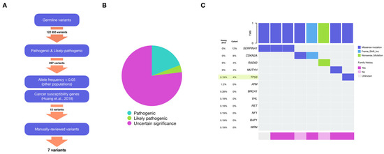 - Huang, K.; Mashl, R.J.; Wu, Y.; Ritter, D.I.; Wang, J.; Oh, C.; Paczkowska, M.; Reynolds, S.; Wyczalkowski, M.A.; Oak, N.; et al. Pathogenic Germline Variants in 10,389 Adult Cancers. Cell 2018, 173, 355–370.e14. [Google Scholar] [CrossRef]