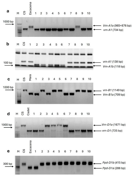 - Palomino, C.; Cabrera, A. Evaluation of the allelic variations in vernalisation (VRN1) and photoperiod (PPD1) genes and genetic diversity in a Spanish spelt wheat collection. Int. J. Mol. Sci. 2023, 24, 16041. [Google Scholar] [CrossRef]