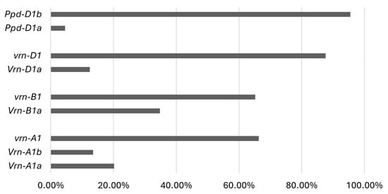 Finally, two PCR products (Figure 1e) were obtained from the club wheat collection with the PPD-D1-specific primers: the dominant Ppd-D1a photoperiod-insensitive and the recessive Ppd-D1b photoperiod-sensitive alleles were present in four (4.5%) and 85 (95.5%) accessions, respectively. Figure 2 shows the allele frequencies of the major effect genes, VRN-A1, VRN-B1, VRN-D1 and PPD-D1, in the T. compactum germplasm studied. The allelic variants of vernalization and photoperiod sensitivity genes in each genotype of the club wheat collection studied are listed in Table S2.