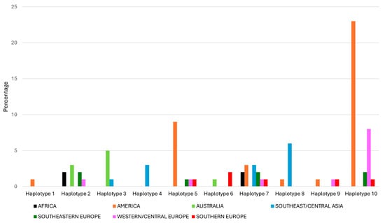 Figure 3 shows the distribution of the ten haplotypes by geographical origin. Haplotype 1 (Vrn-A1a-Vrn-B1a-Vrn-D1a-Ppd-D1a) carrying the dominant alleles for the VRN-A1, VRN-B1, VRN-D1 and PPD-D1 genes was detected in the cultivar Calorwa from the USA. Haplotypes 3 and 6 were mainly distributed in Australia, Southeast/Central Asia and Southeastern Europe. Haplotype 4 (vrn-A1-Vrn-B1a-Vrn-D1a-Ppd-D1b) only occurred in Southeast/Central Asia, specifically in accessions from Kazakhstan and Kyrgyzstan. Haplotype 7 (vrn-A1-Vrn-B1a-vrn-D1-Ppd-D1b) was the most common of the spring genotypes, and it was also the most universally distributed across all continents, except Australia. Haplotype 8 was mainly found in Southeast/Central Asia. Finally, winter genotypes (haplotypes 9 and 10) were common in America and Southern Europe, Western/Central Europe and Southeastern Europe, while they were absent in Africa, Australia and Southeast/Central Asia.