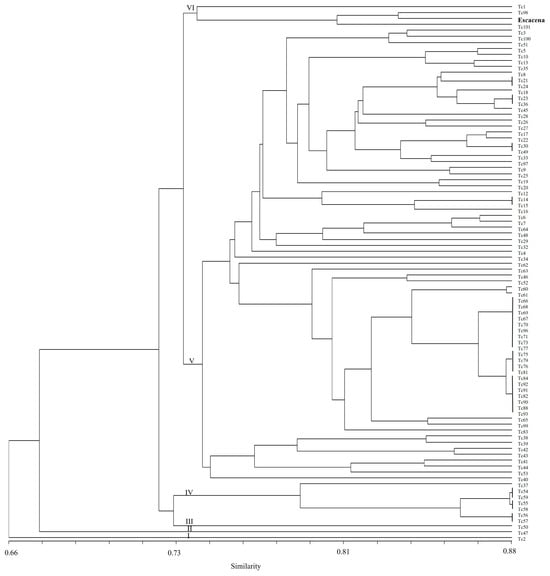 The dendrogram indicates six main groups (Figure 4). The first group is separated from all the others and contains one accession (Tc2), a landrace from Kyrgyzstan. Groups II and III also contain just one accession each (Tc47 and Tc50, respectively), both from the USA. Group IV consists of seven accessions (T37, T54, T55, T56, T57, T58 and T59), all of them landraces from Pakistan. Group V was divided into two subgroups: Group V-1 is composed of eight accessions, five of them from Australia (Tc41, Tc42, Tc43, Tc,44; Tc53), two from Africa (Tc39, Tc40) and one from Pakistan (Tc38), and Group V-2 is a wider cluster containing 68 accessions from all eco-geographical regions studied except Africa. Finally, Group VI comprises three accessions (Tc1, Tc98 and Tc101), one collected in Mexico, one in (the then) Czechoslovakia and one in Georgia. The common wheat cultivar Escacena was also included in this cluster.