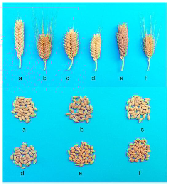 Spike and seed morphology of different T. compactum accessions. From left to right: (a) PI 25970; (b) PI 60740; (c) PI 164160; (d) PI 191542; (e) PI 294567 and (f) PI 330540.