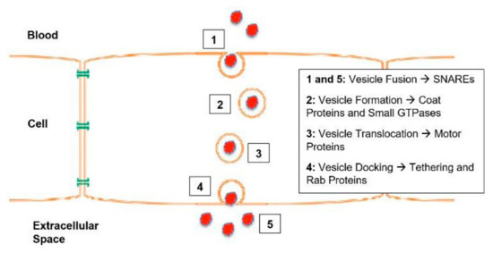 Transcytosis allows multicellular organisms to selectively transport molecules between distinct environments while maintaining the composition of each [12]. Transcytosis of macromolecules involves five steps: Equilibration of dissolved macromolecules in the capillary lumen with the fluid phase inside the open vesicle; pinching off of the vesicle; vesicle shuttling to the cytoplasm and transient fusion with other vesicles within the cytoplasm, allowing intermixing of the vesicular content; fusion of vesicles with the opposite plasma membrane; and equilibration with the opposite extracellular fluid phase [1]. A simplified diagram of transcytosis is shown in Figure 1, and Figure 2 shows the different factors that mediate each step in the transcytosis process.