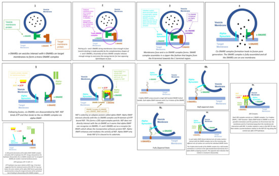 As shown in Figure 3, NSF disassembles the cis-SNARE complex [16]. Similar to other AAA+ proteins, NSF monomers assemble to form a homohexamer [16]. Each monomer consists of the N-terminal domain and two AAA+ domains [16]. The overall positive charge of the N-terminal domains is thought to interact with the C-terminal negative charge distribution of alpha-SNAP [16]. The N-terminal of NSF is also thought to interact with the SNARE complexes, but there is little evidence to support this [16]. It should be noted that NSF only binds to SNAP in the presence of ATP [16,18]. Wang et al. discovered that SNAP binds to the SNARE complex with an opposing structural twist and that the conversion of NSF from its ATP-bound to adenosine diphosphate-bound (ADP-bound) form drives conformational changes, which ultimately facilitate SNARE complex disassembly [14].