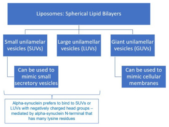 Vesicle Trafficking: α-syn’s ability to interact with lipid membranes is the main reason for its role in modulating vesicle trafficking. Liposomes are spherical lipid bilayers that are classified into three types, as shown in Figure 5.
