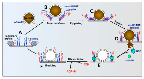 The Rothman proposal (also known as the SNARE Hypothesis, shown in Figure 3), as discussed in the introduction of this paper, hypothesizes a universal “docking and fusion” particle to explain vesicle docking and fusion at all locations [24]. The process of vesicle fusion mediated by SNAREs is shown in Figure 8.