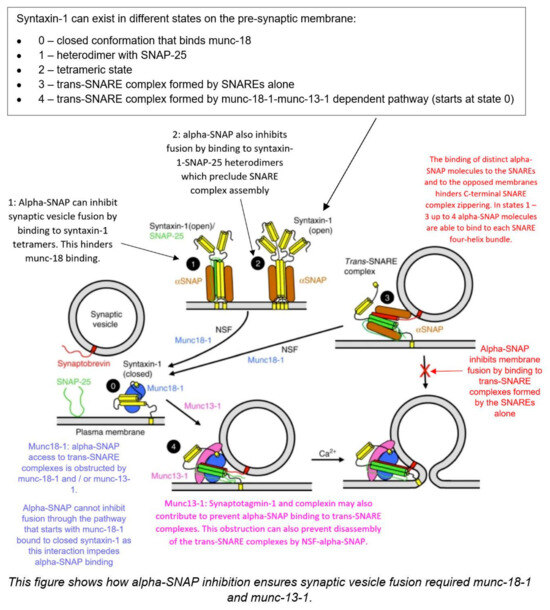 - Stepien, K.P.; Prinslow, E.A.; Rizo, J. Munc18-1 is crucial to overcome the inhibition of synaptic vesicle fusion by αSNAP. Nat. Commun. 2019, 10, 4326. [Google Scholar] [CrossRef] [PubMed]