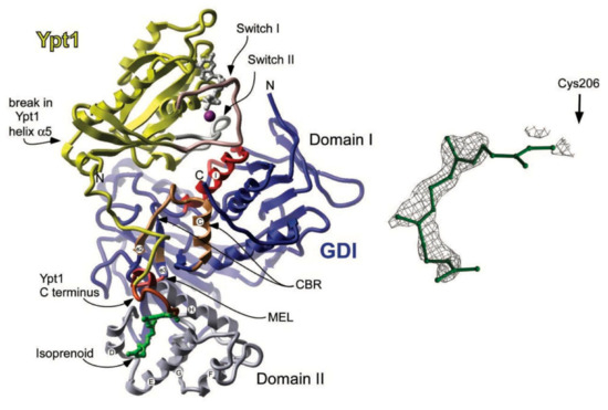 - Rak, A.; Pylypenko, O.; Durek, T.; Watzke, A.; Kushnir, S.; Brunsveld, L.; Waldmann, H.; Goody, R.S.; Alexandrov, K. Structure of Rab GDP-dissociation inhibitor in complex with prenylated YPT1 GTPase. Science 2003, 302, 646–650. [Google Scholar] [CrossRef] [PubMed]