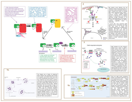 Cycling of Rab Proteins and Functions of Rab Proteins—Molecular Switch; Cargo Selection and Vesicle Formation; Vesicle Movement; Vesicle Uncoating; Vesicle Tethering; and Membrane Fusion [17,28,54,55,56,57,58].