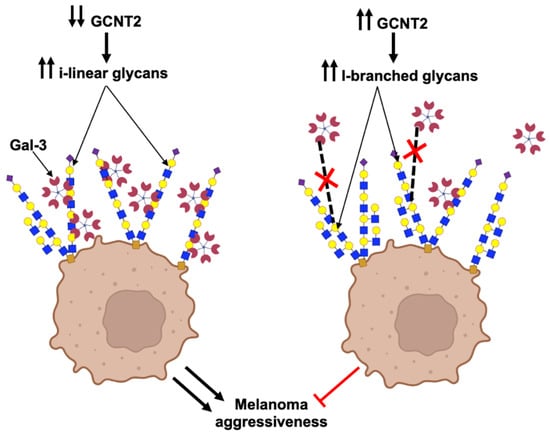 - Sweeney, J.G.; Liang, J.; Antonopoulos, A.; Giovannone, N.; Kang, S.; Mondala, T.S.; Head, S.R.; King, S.L.; Tani, Y.; Brackett, D. Loss of GCNT2/I-branched glycans enhances melanoma growth and survival. Nat. Commun. 2018, 9, 3368. [Google Scholar] [CrossRef]