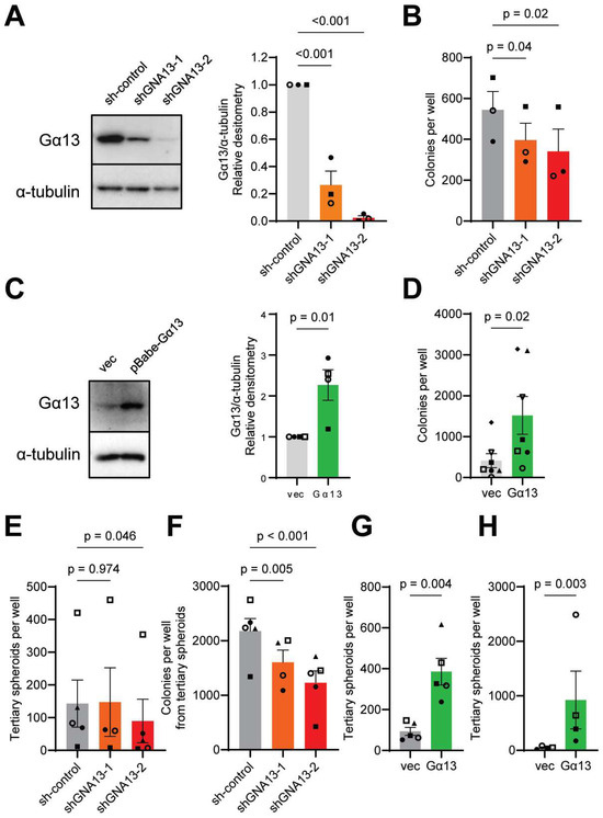 To further assess the role of Gα13 in clonogenic growth, we generated spheroids in 125 µg/mL of Matrigel [Supplementary Figure S1E] [35,36]. Upon serial replating, loss of Gα13 in PC3 cells reduced tertiary spheroid formation and suppressed colony formation from tertiary spheroids [Figure 1E,F]. Stable expression of shGNA13 maintained GNA13 knockdown throughout the experiment [Supplementary Figure S1F]. Similarly, overexpression of Gα13 in LNCaP significantly increased tertiary spheroid formation and colony formation [Figure 1G,H]. These findings indicate that Gα13 contributes to processes involved in tumor initiation in the prostate cancer cell lines PC3 and LNCaP.