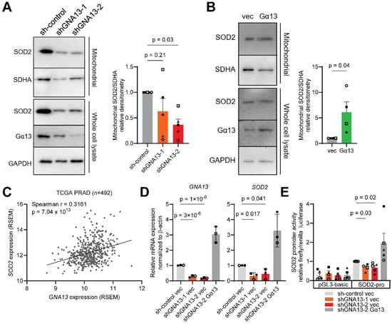 The association between Gα13 and mitochondrial SOD2 expression. (A,B) Effect of Gα13 on mitochondrial SOD2 protein levels in (A) PC3 and (B) LNCaP cells in representative Western blots. (C) Correlation plot of GNA13 against SOD2 mRNA expression from TCGA database of prostate cancer patient (PRAD) tumor samples extracted from cBioPortal. Correlations were calculated by Spearman’s Rank Correlation for the correlation coefficient rho. (D) Effect of Gα13 on SOD2 mRNA expression in PC3 cells. (E) Effect of Gα13 on SOD2 promoter activity in PC3 cells. The ratio of Firefly to Renilla luciferase activity was calculated, and fold change relative to sh-control cells is shown. (A,B,D,E) Data points represent independent experiments. p values calculated by unpaired, two-tailed t-tests or unpaired one-way ANOVA with Dunnett’s post hoc test.