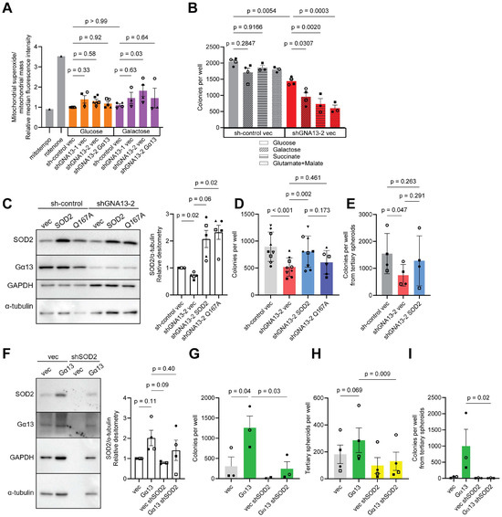 Loss of Gα13 increases sensitivity to oxidative metabolic stress and decreases 3D colony formation. (A) Effect of Gα13 on mitochondrial superoxide levels in PC3 cells in 11 mM glucose or 10 mM galactose media. Relative mitochondrial superoxide to mitochondrial mass ratio was calculated by median fluorescence intensity (MFI) of MitoSOX Red divided by MFI of MitoView Green. PC3 sh-control cells were treated with 1 mM rotenone as a positive control and 100 µM MitoTempo as a negative control. (B) Effect of Gα13 loss on long-term colony formation in non-glycolytic metabolites media in PC3 cells. (C) Western blot of stable expression of SOD2 and catalytically inactive SOD2 (Q143A) in monolayer PC3 cells. (D,E) Effect of SOD2 or SOD2 (Q143A) expression on (D) colony formation and (E) tertiary spheroid colony formation in PC3 cells after silencing Gα13. (F) Western blot of stable knockdown of SOD2 in monolayer LNCaP cells. (G–I) Effect of SOD2 knockdown on (G) colony formation, (H) spheroid replating and (I) tertiary spheroid colony formation after overexpression of Gα13 in LNCaP cells. All data points represent independent experiments. (A–G) p values calculated by matched, one-way ANOVA with Tukey’s post hoc test. (H,I) p values calculated by paired, two-tailed t-tests.