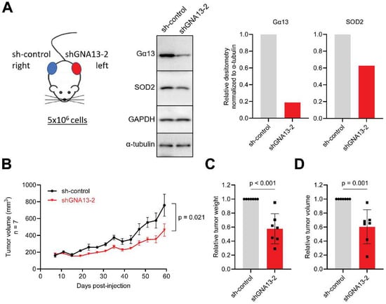 To explore the relevance of our in vitro findings on tumor formation in an in vivo model, we generated xenograft tumors using PC3 cells in NOD-SCID mice (see Methods). To examine the tumorigenic effect associated with silencing of GNA13 in the same animal, we subcutaneously injected 5 × 106 PC3 sh-control or shGNA13-2 cells into the right and left flank, respectively, in each mouse [Figure 4A, left]. At the time of xenograft implantation, SOD2 protein levels were lower in PC3 shGNA13-2 cells by approximately 40% compared to sh-control cells [Figure 4A, right]. Notably, silencing GNA13 in PC3 cells significantly reduced tumor growth rate and tumor weight by approximately 40% [Figure 4B–D, Supplementary Figure S8A]. Furthermore, we found no significant change in the weight of the mice, and the PC3 shGNA13-2 tumors showed sustained silencing of GNA13 [Supplementary Figure S8B,C]. In keeping with our in vitro results, these data support a role for Gα13 in tumor formation in vivo.