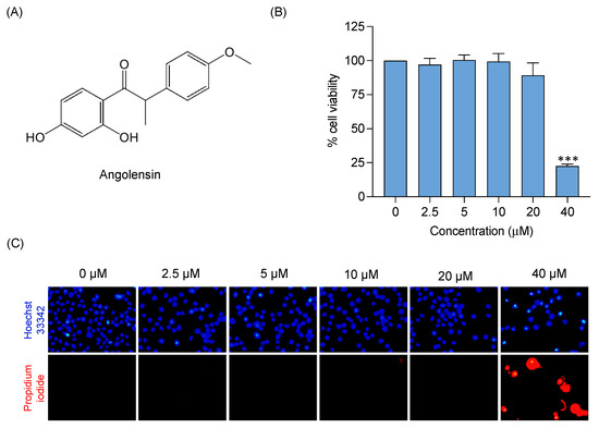 A cytotoxicity assessment of angolensin (Figure 1A) was performed to determine its non-toxic concentrations in BV-2 microglial cells. The cells were incubated with a series of angolensin concentrations (0, 2.5, 5, 10, 20, and 40 µM) for 24 h. The results indicated that 40 µM of angolensin significantly reduced cell viability compared to the control group (DMSO 0.5%), indicating cytotoxicity. Concentrations ≤ 20 µM showed no significant differences in the cell viability compared to the control group, suggesting no cytotoxic effects on the cells (Figure 1B). Further, the Hoechst 33342 and propidium iodide (PI) staining did not show apoptosis and necrosis in the cells treated with 0–20 µM angolensin (Figure 1C). Therefore, concentrations ≤ 20 µM were selected for further assessment of anti-neuroinflammatory activity.
