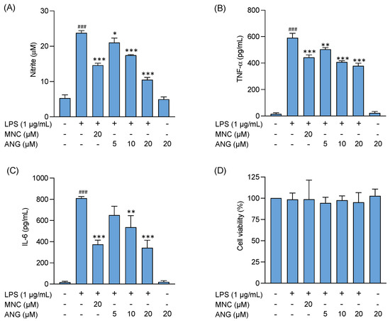 A cytotoxicity assay was conducted to establish non-toxic concentrations of angolensin in BV-2 cells. Initially, BV-2 cells were seeded in 96-well plates at a density of 2 × 104 cells per well. These cells were then exposed to varying angolensin concentrations (0, 2.5, 5, 10, 20, and 40 µM) following 24 h of seeding. After an additional 24 h, cell viability was evaluated using the MTT assay. Non-toxic concentrations were used to evaluate the efficacy of the compounds in BV-2 cells stimulated by LPS. BV-2 cells were pretreated with the non-toxic concentrations of angolensin for 1 h, followed by co-incubation with LPS (1 µg/mL) [40]. After 24 h, the culture medium was collected for determining cytokine levels (TNF-α and IL-6) and nitrite levels.