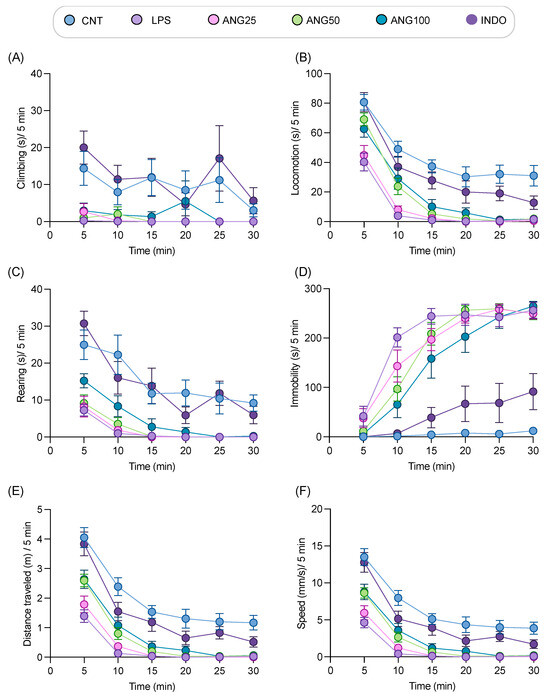 Time course effect of angolensin on exploratory behaviors in LPS-induced mice. The behaviors were presented as duration of climbing (A), locomotion (B), rearing (C) immobility (D), distance traveled (E), and speed (F). Data are expressed as mean ± SEM (eight mice per group). The differences between groups were analyzed by one-way ANOVA followed by the Bonferroni post hoc test. CNT (vehicle-treated mice, vehicle control), LPS (LPS-induced mice, disease control), ANG25 (angolensin 25 mg/kg), ANG50 (angolensin 50 mg/kg), ANG100 (angolensin 100 mg/kg), INDO (indomethacin 10 mg/kg).