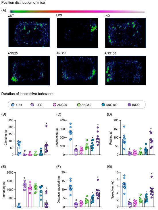 Effect of angolensin on exploratory behaviors in lipopolysaccharide (LPS)-induced mice. The position distribution of mice in the home-cage environment (A). Summary of behaviors presented as the duration of climbing (B), locomotion (C), rearing (D), immobility (E), and characteristics of locomotive behaviors presented as distance traveled (F) and speed (G). Data are expressed as mean ± SEM (eight mice per group). # p < 0.05, compared to the vehicle-treated group and * p < 0.05 compared to the LPS-induced group; one-way ANOVA followed by Bonferroni post hoc test. CNT (vehicle-treated mice, vehicle control), LPS (LPS-induced mice, disease control), ANG25 (angolensin 25 mg/kg), ANG50 (angolensin 50 mg/kg), ANG100 (angolensin 100 mg/kg), INDO (indomethacin 10 mg/kg).