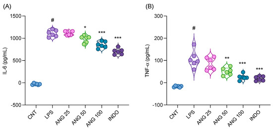 Biochemical analysis of proinflammatory cytokine levels in plasma. The effect of angolensin on LPS-induced IL-6 expression (A) and TNF-α expression (B) in plasma, as analyzed by ELISA. Data are expressed as mean ± SEM. # p < 0.001, compared to the vehicle-treated group and * p < 0.05, ** p < 0.01, and *** p < 0.001 compared to the LPS-induced group; one-way ANOVA followed by Bonferroni post hoc test. CNT (vehicle-treated mice, vehicle control), LPS (LPS-induced mice, disease control), ANG25 (angolensin 25 mg/kg), ANG50 (angolensin 50 mg/kg), ANG100 (angolensin 100 mg/kg), INDO (indomethacin 10 mg/kg).