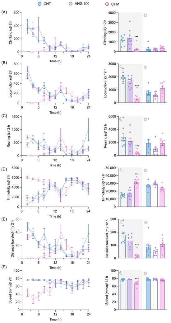 Effect of angolensin on the general behaviors of mice. Mice were administered the vehicle, angolensin (100 mg/kg), and chlorpromazine (5 mg/kg) intraperitoneally, and their home-cage behaviors were measured for 24 h. Time course effects of the treatments are shown at 2-h intervals, and summary data for nighttime and daytime (12-h intervals) are presented separately for each home-cage behavior: climbing (A), locomotion (B), rearing (C), immobility (D), distance traveled (E), and speed (F). Data are presented as mean ± SEM (n = 8 mice per group). *** p < 0.001 compared to the vehicle-treated group; one-way ANOVA followed by Dunnett’s post hoc test. CNT (vehicle-treated mice), ANG100 (angolensin 100 mg/kg), CPM (chlorpromazine 5 mg/kg).