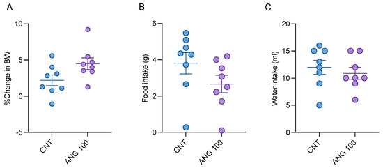 The effect of angolensin on the general well-being of mice is indicated as effect on body weight (A), food intake (B), and water intake (C). Data are presented as mean ± SEM (n = 8 mice per group). No significant differences were observed between the angolensin-treated group and the vehicle-treated group for any of the parameters tested (Student’s t-test). CNT, 5% DMSO; ANG100, angolensin (100 mg/kg).