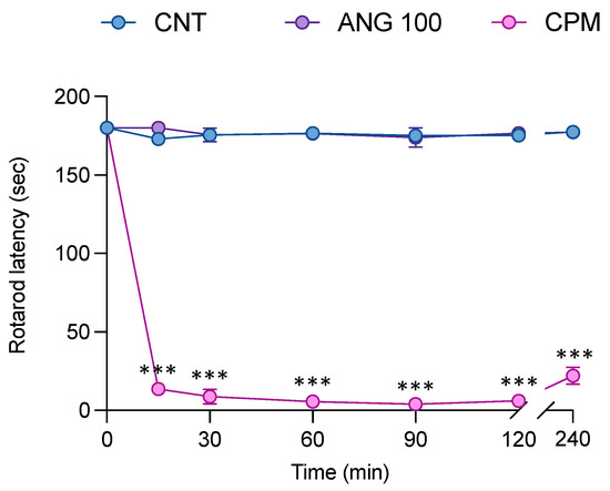 The effect of angolensin on motor coordination in mice. Mice were treated with vehicle, angolensin (100 mg/kg), and chlorpromazine (5 mg/kg, CPM) intraperitoneally, and rotarod latency was measured at 15, 30, 60, 90, 120, and 240 min post-treatment. The data are displayed as mean ± SEM (n = 8 mice per group). *** p < 0.001 compared to the vehicle-treated mice; one-way ANOVA followed by Dunnett’s post hoc test.