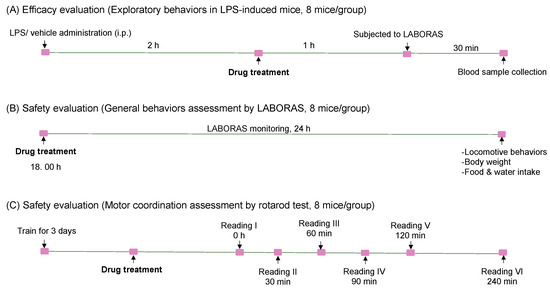 Angolensin was initially dissolved in DMSO (Sigma-Aldrich, St. Louis, MO, USA) and then diluted with normal saline to achieve a final DMSO concentration of 5%. The intraperitoneal route was used to administer all treatments, including angolensin at doses of 25, 50, and 100 mg/kg, and the vehicle (5% DMSO in normal saline), maintaining a constant volume of 10 mL/kg body weight. Indomethacin (10 mg/kg) was used as the positive control for the mouse model of LPS-induced sickness behaviors, while chlorpromazine (5 mg/kg) was used as the positive control for CNS safety evaluations. Both indomethacin and chlorpromazine were dissolved in normal saline and administered intraperitoneally. For each behavioral evaluation, 8 mice per group were used (Figure 9).